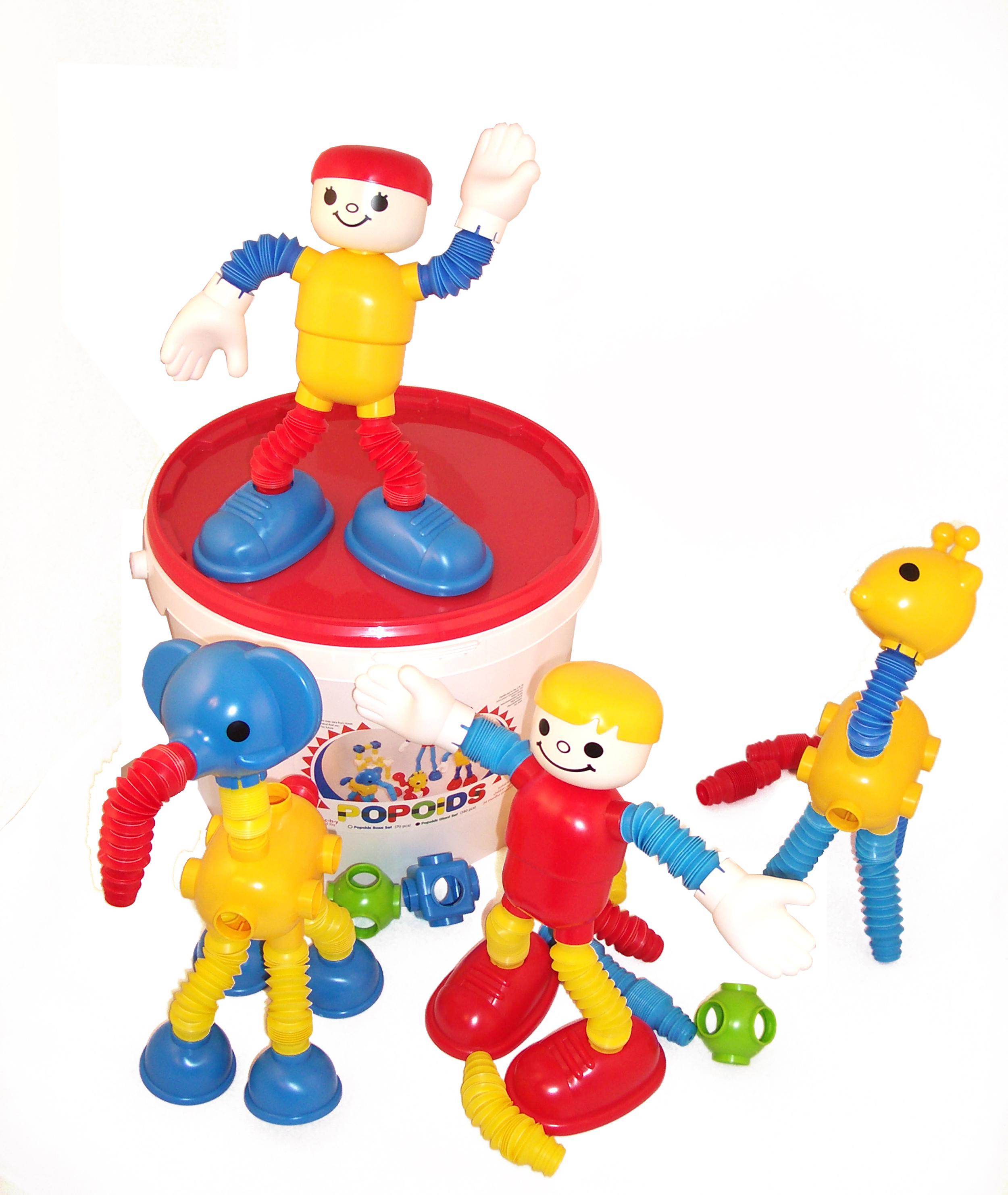 Popoids is the unique flexible building system which links heads, wheels, bodies and shapes to bendy, popping bellows. It can be easily manipulated by children who find the popoids great fun and love to extend the bellows to hear the fantastic noise they make.