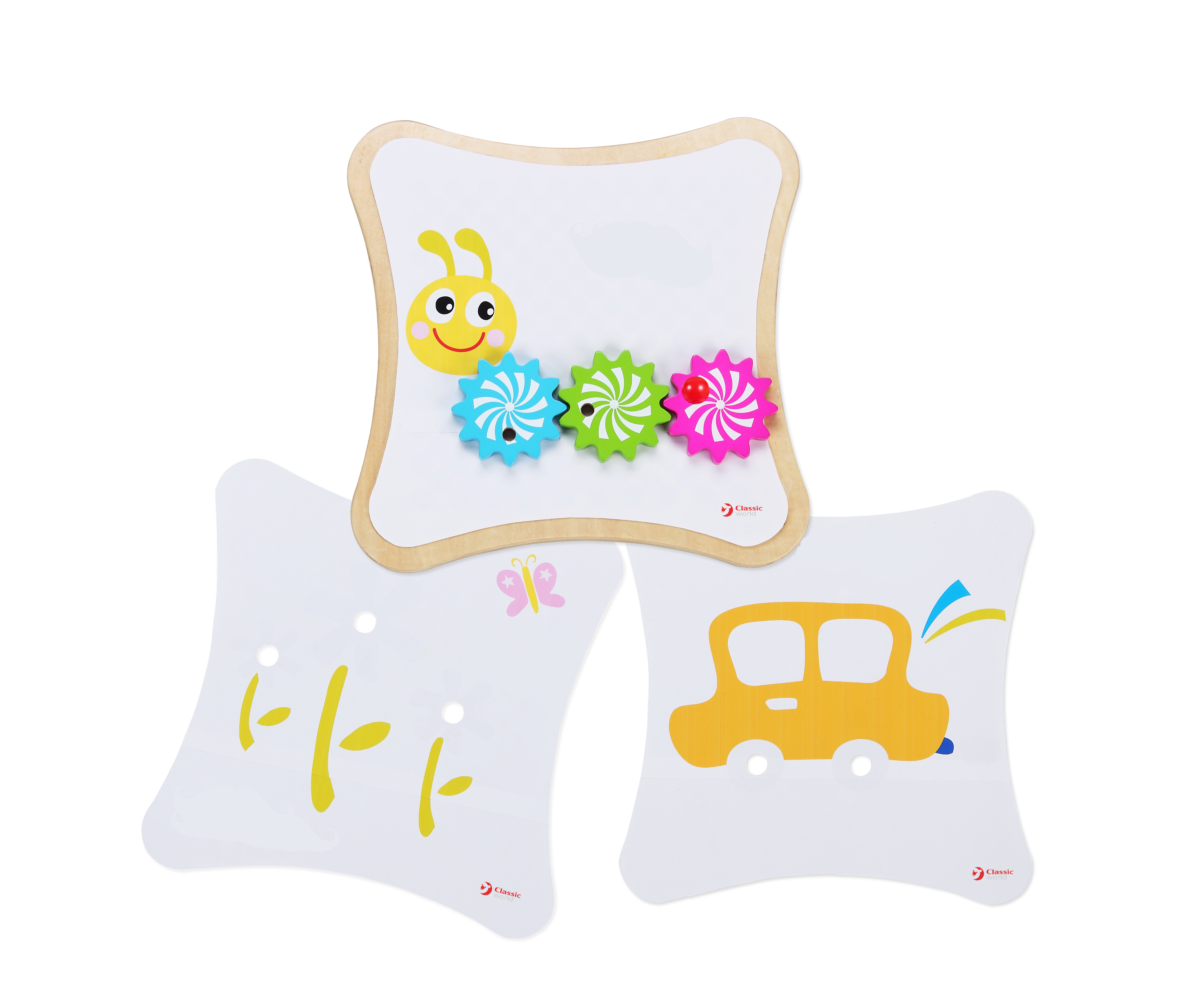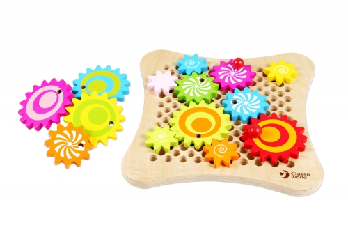 A complex concept with a simple design. The nice colourful wooden gears can be arranged in many ways to turn one another. Teach kids to be future engineers!