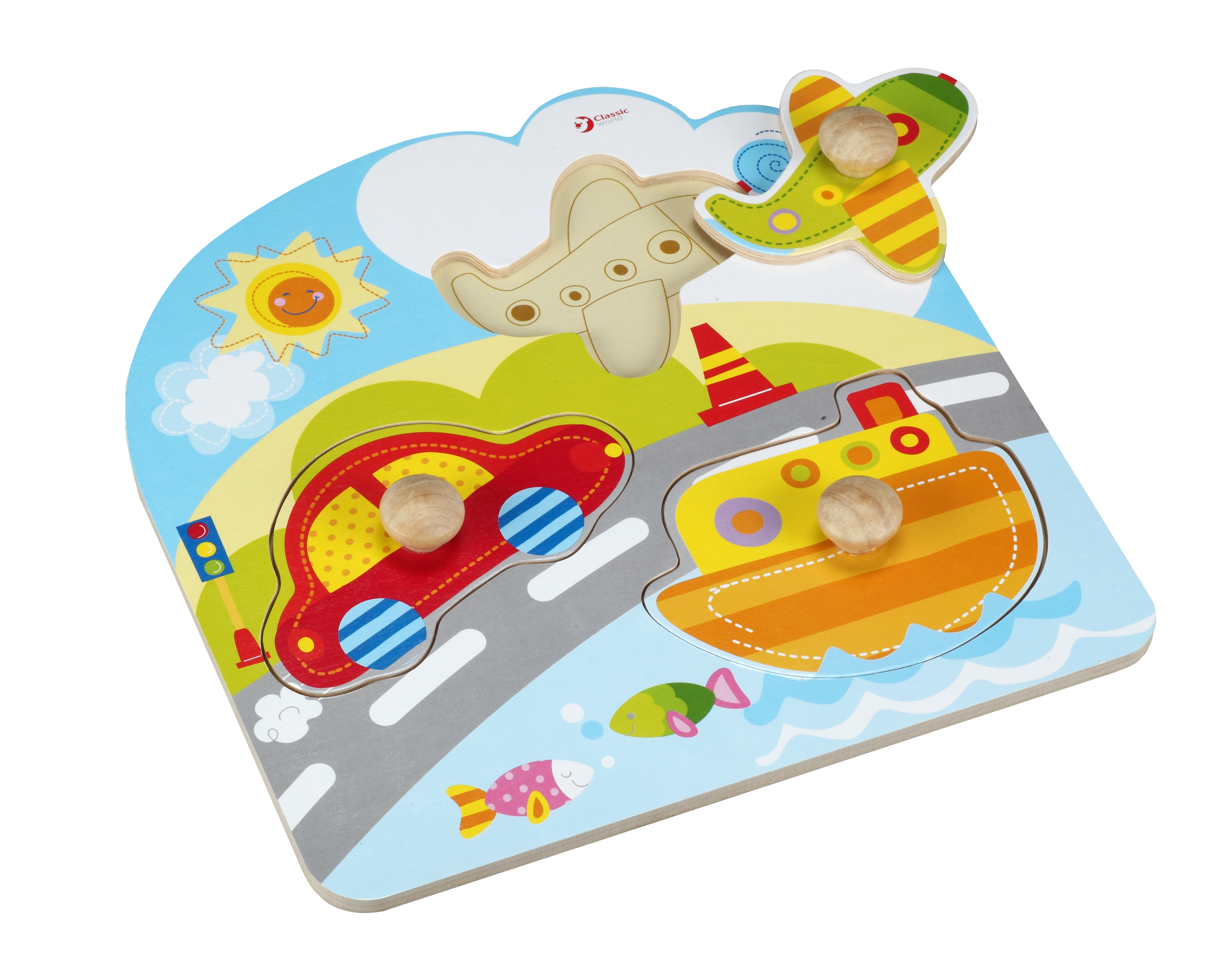 A bright and vividly coloured puzzle, perfect for little hands. Each piece has a handle to make movement easier. This puzzle also helps children to recognise different kinds of transportation.