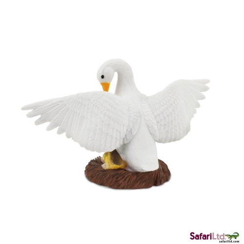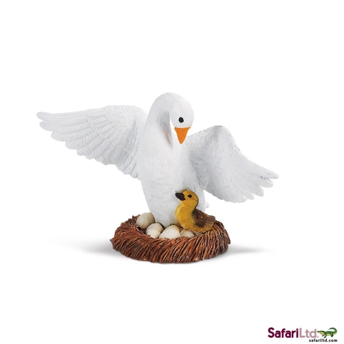Our Goose flaps her immense wings and settles into the nest with a newly hatched gosling.