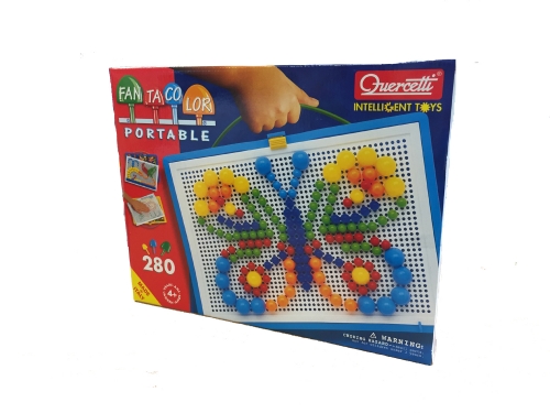 With Fanatacolour Portable children create beautiful mosaics by inserting pegs into the pegboard. While developing their hand-eye coordination children have fun inventing their own designs or following the examples shown. To undo a design turn the pegboard over and push the pegs directly into the case. What could be easier? The carry handle can be used to hang completed mosaics on the wall with the case as a colourful frame. Children can decorate their rooms with original masterpieces! Everything is kept in one compact carry case: pegs go inside, pegboard locks on the top – easy to carry and perfect for travel. All pieces have round edges and are totally unbreakable and safe. Fantacolour Portable is one of the most popular European toys and it is internationally patented and copyrighted.
