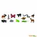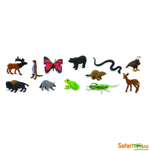 This set includes: a bald eagle, black bear, monarch butterfly, black snake, bison, elk, raccoon, frog, doe, grasshopper, beaver and a river otter.
