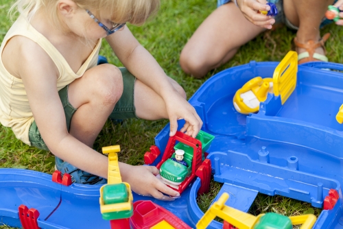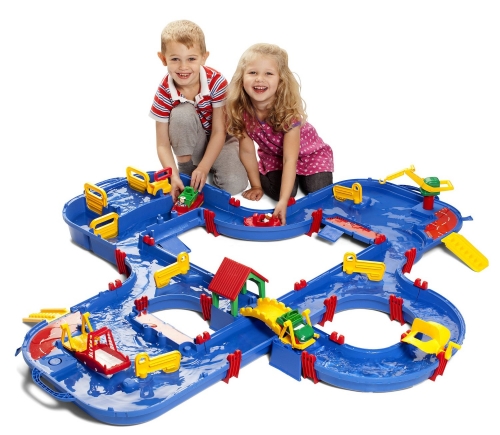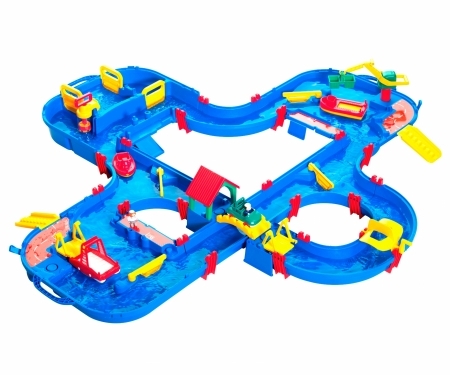 This deluxe system is Aquaplay’s largest and contains most of our play features. The popular lock is of course one of the main attractions – let the bear take the tugboat out for an excursion through the lock system. You regulate the water level by using the pump and opening the lock gates. The boat will soon be out in the canals again to continue its journey! The ferry has its own space at the ferry station. Here is the perfect place to pick up the amphibian truck when it has collected its cargo at land. The amphibian truck also has the possibility to slide down into the water and function as a boat. On the opposite side of the set, the harbour is located. Here you can let the mate load the container on the transport boat with assistance of the crane. By turning the paddle wheel the water moves the vehicles round and round through the canals.
