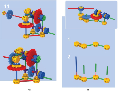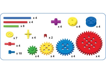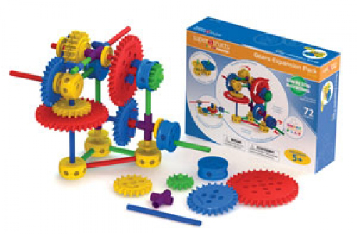 The 72 piece Gear Expansion set includes plans to create models that demonstrate how to use cranks and gears. The set has 12 large gears plus enough rods, wheels and connectors to keep everyone learning, busy, and happy for hours.