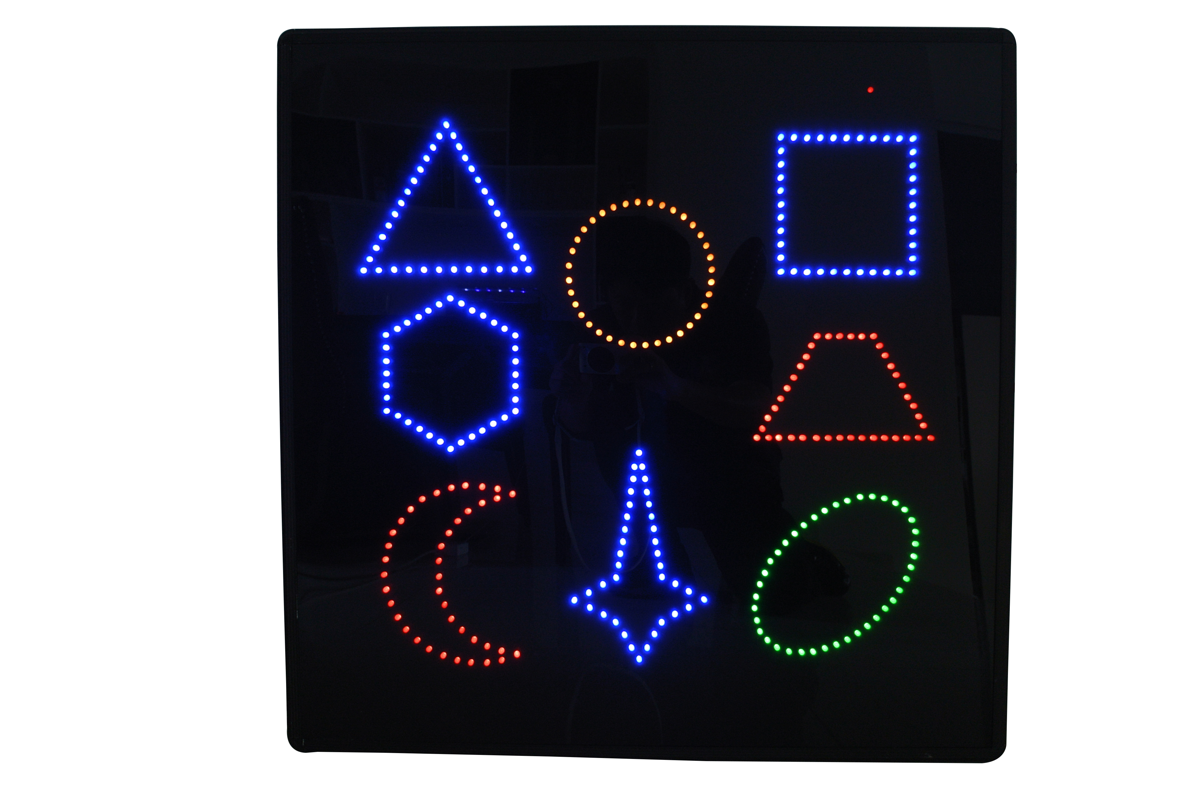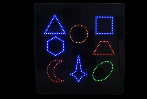 The panel is a dark screen in a metal frame. The screen has woven strands of fibre optics in the form of geometric shapes of different colours. The light source (LED) and power supply are built-in. Using the remote control mode this allows you to switch the backlight geometric shapes, their sequence variation and duration of light emission.