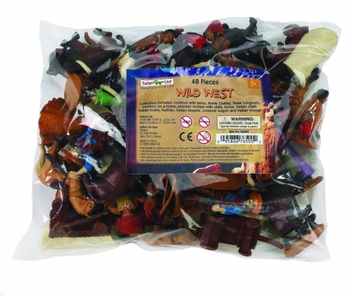 The Wild West Bulk Bag includes: indian teepee, indian woman, Texas Longhorn bull, covered wagon, buffalo, indian chief, pioneer woman, cowboy, Annie Oakley, cowboy on horse and indian brave.
