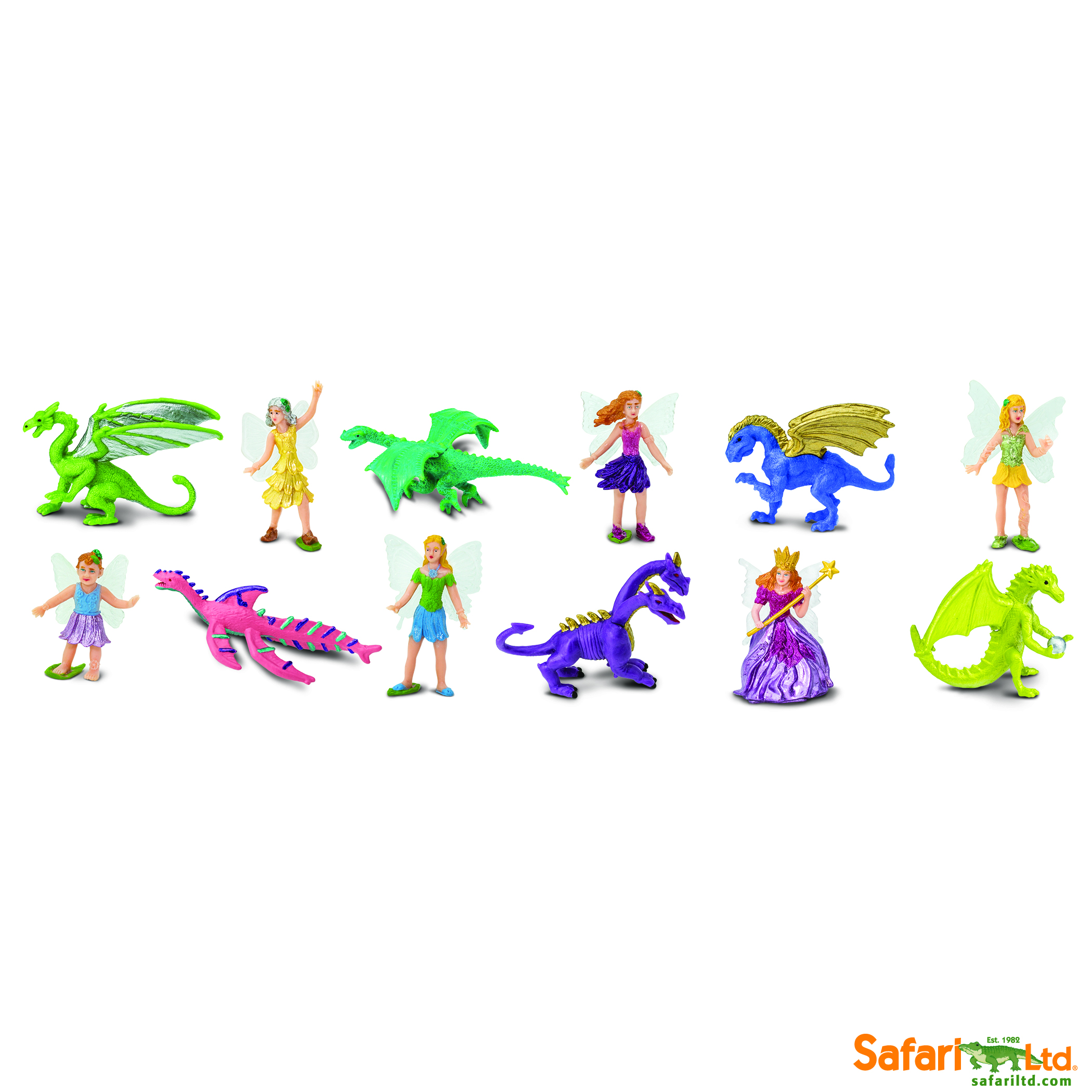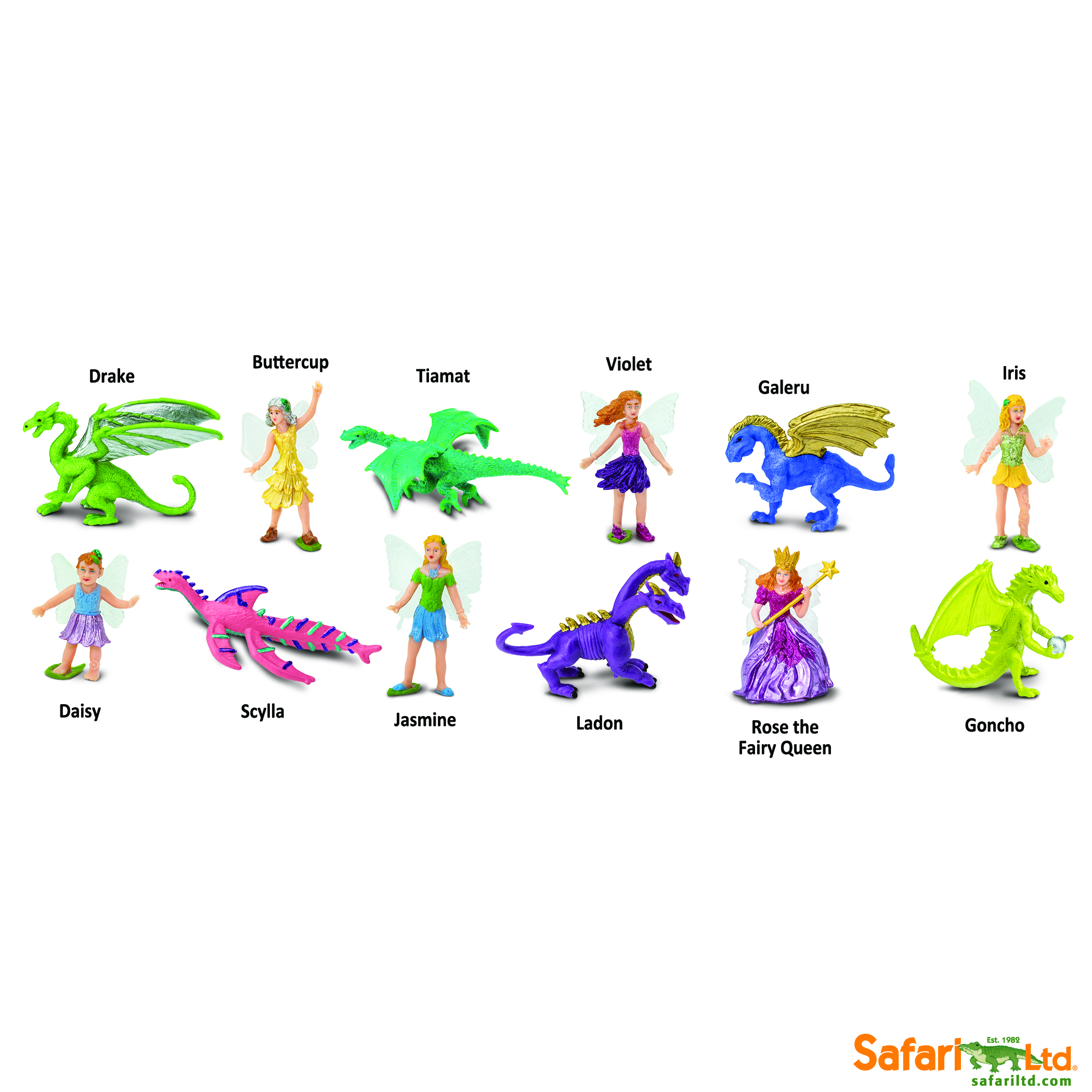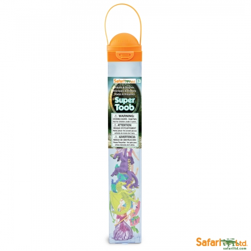 Enter a world of magical charms and mystical beasts! This Super Toob includes the fearsome dragons Tiamat, Drake, Scylla, Galeru, Ladon, and Goncho, as well as the fairy queen Rose and her 5 friendly helpers: Iris, Violet, Jasmine, Daisy and Buttercup!