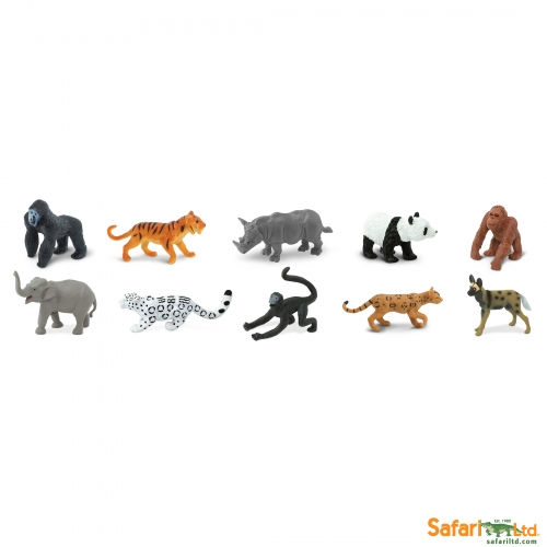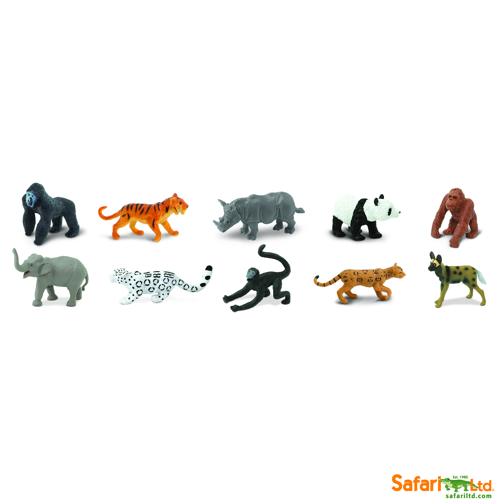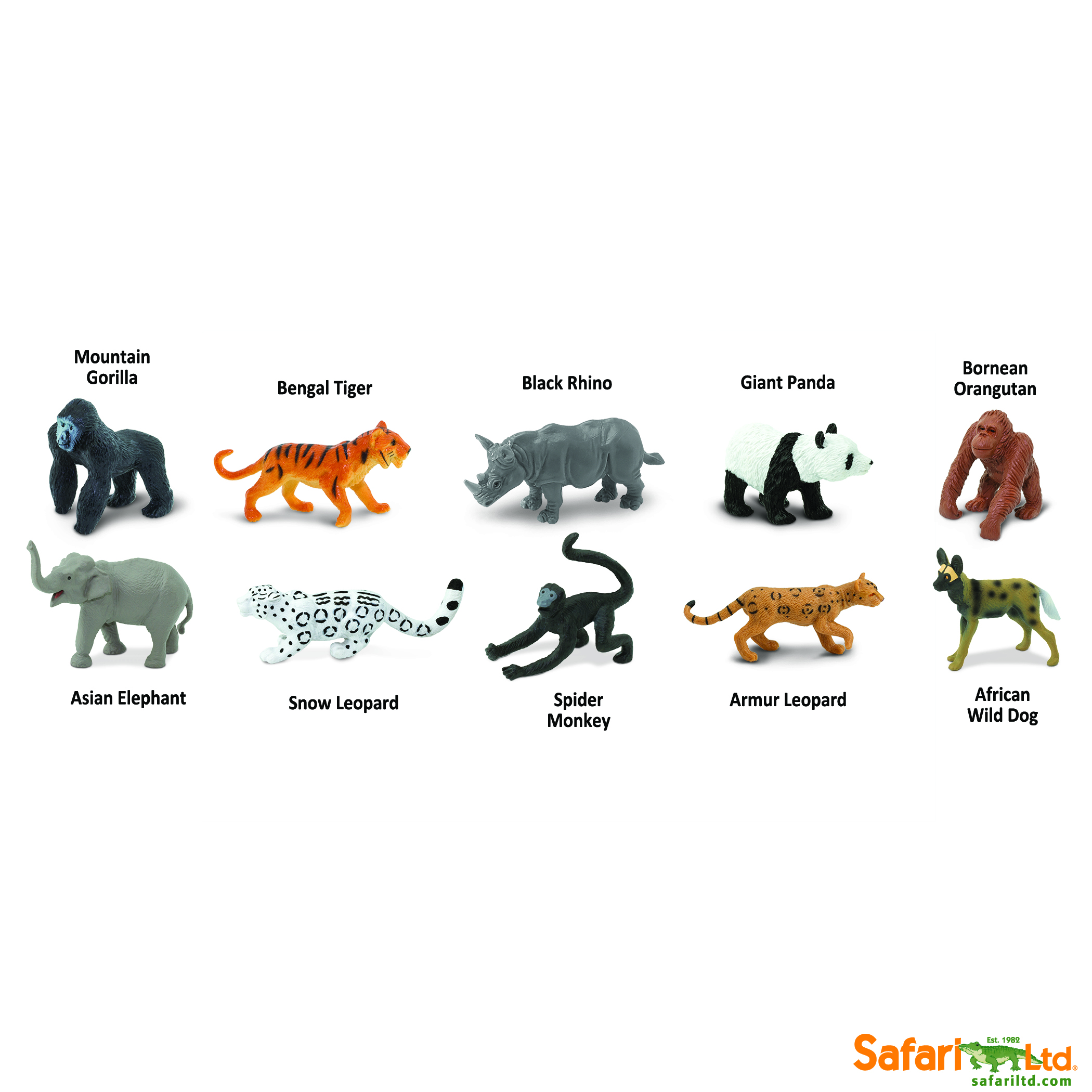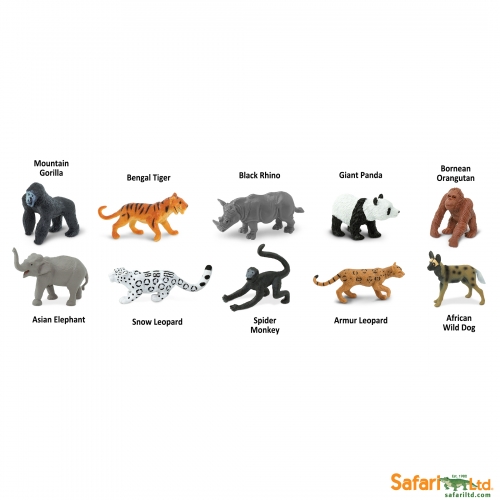 Few things are more necessary than protecting the endangered species on our planet! This Toob contains a mountain gorilla, giant panda, Bengal tiger, orangutan, black rhino, black spider monkey, Armur leopard, African wild dog, Asian elephant, and a snow leopard.