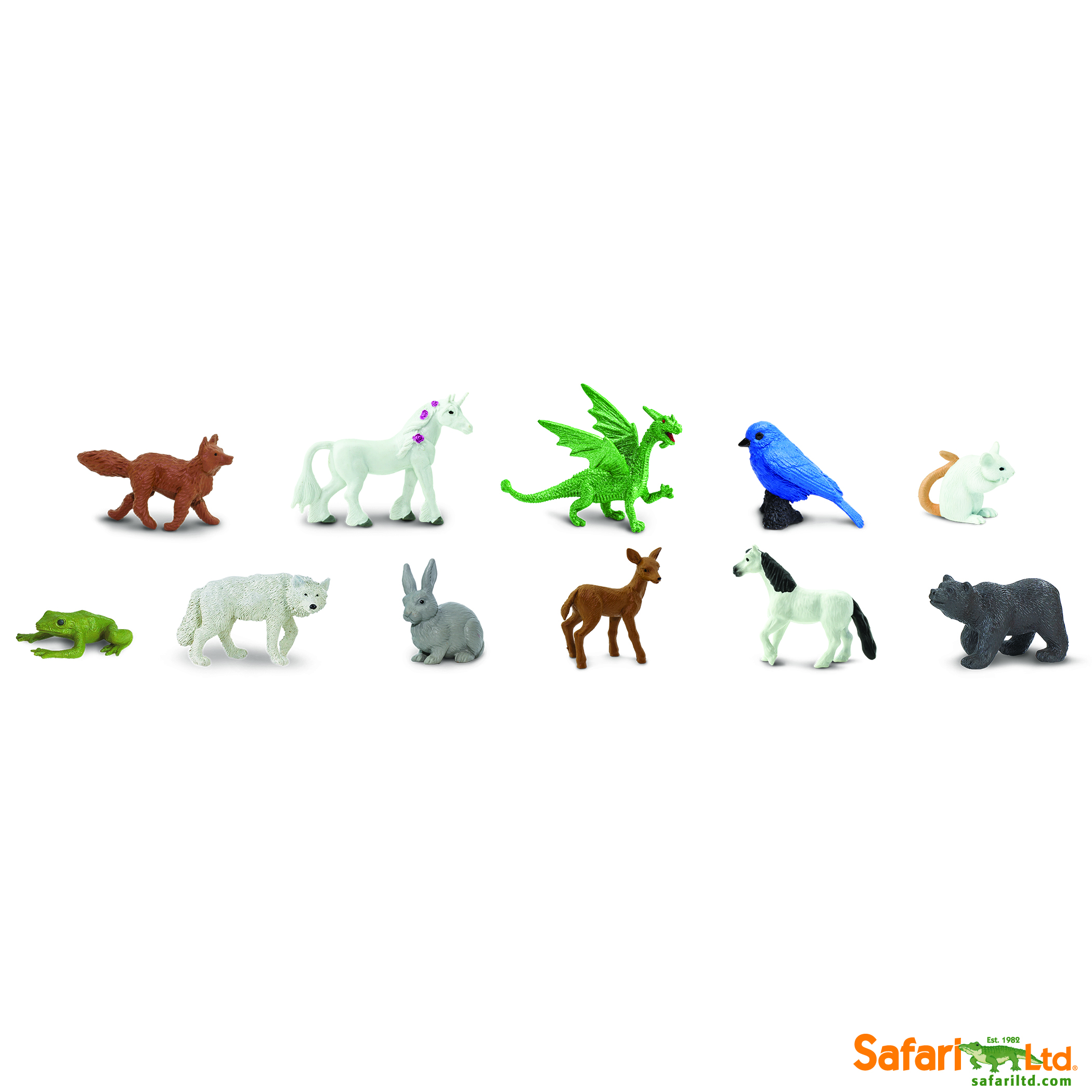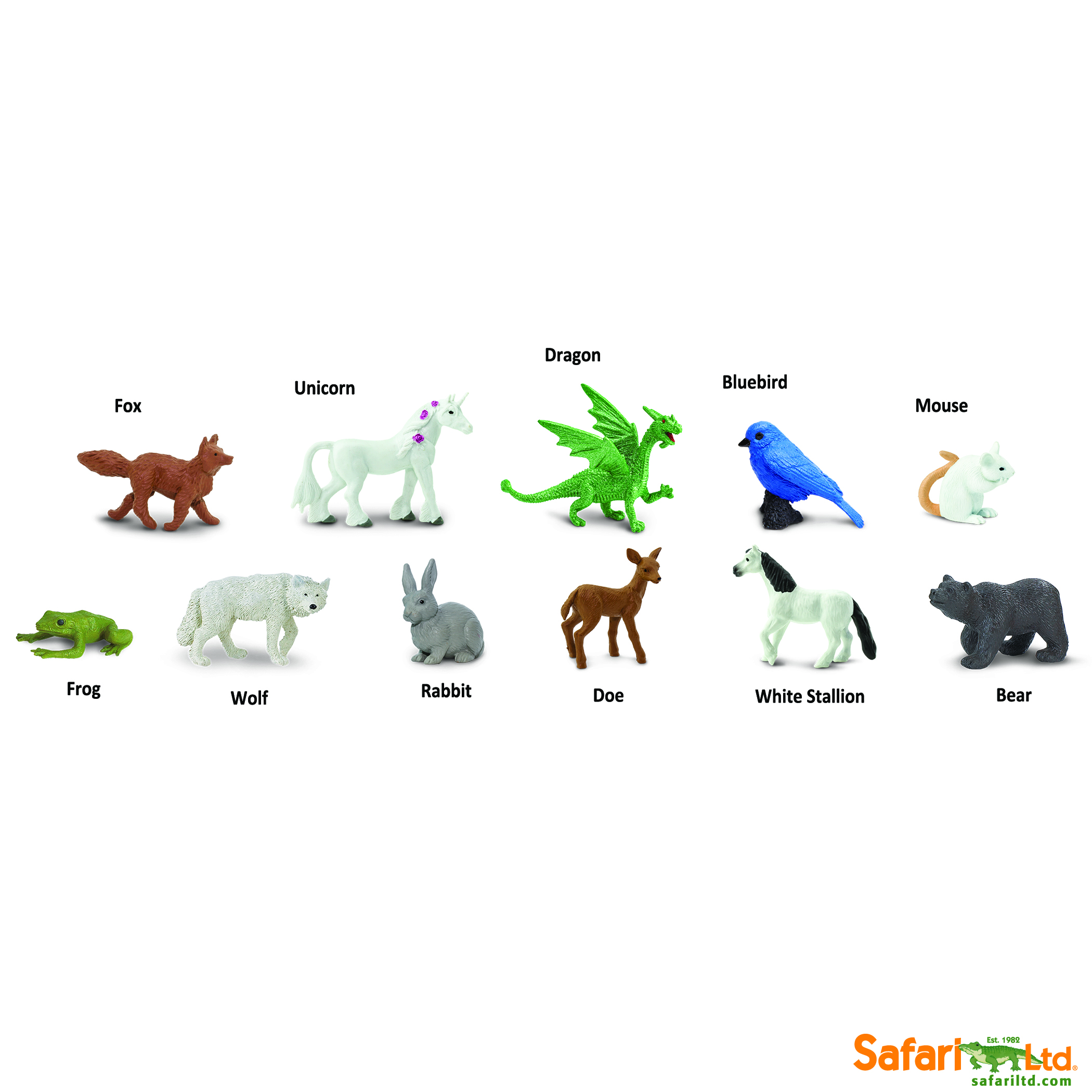 Experience these amazing animals of fantasy and folklore! This Toob includes a unicorn, dragon, frog, wolf, rabbit, doe, white stallion, bear, mouse, bluebird, and a fox. It’s perfect to help you tell a tall tale with the help of creatures both real and imaginary.