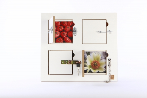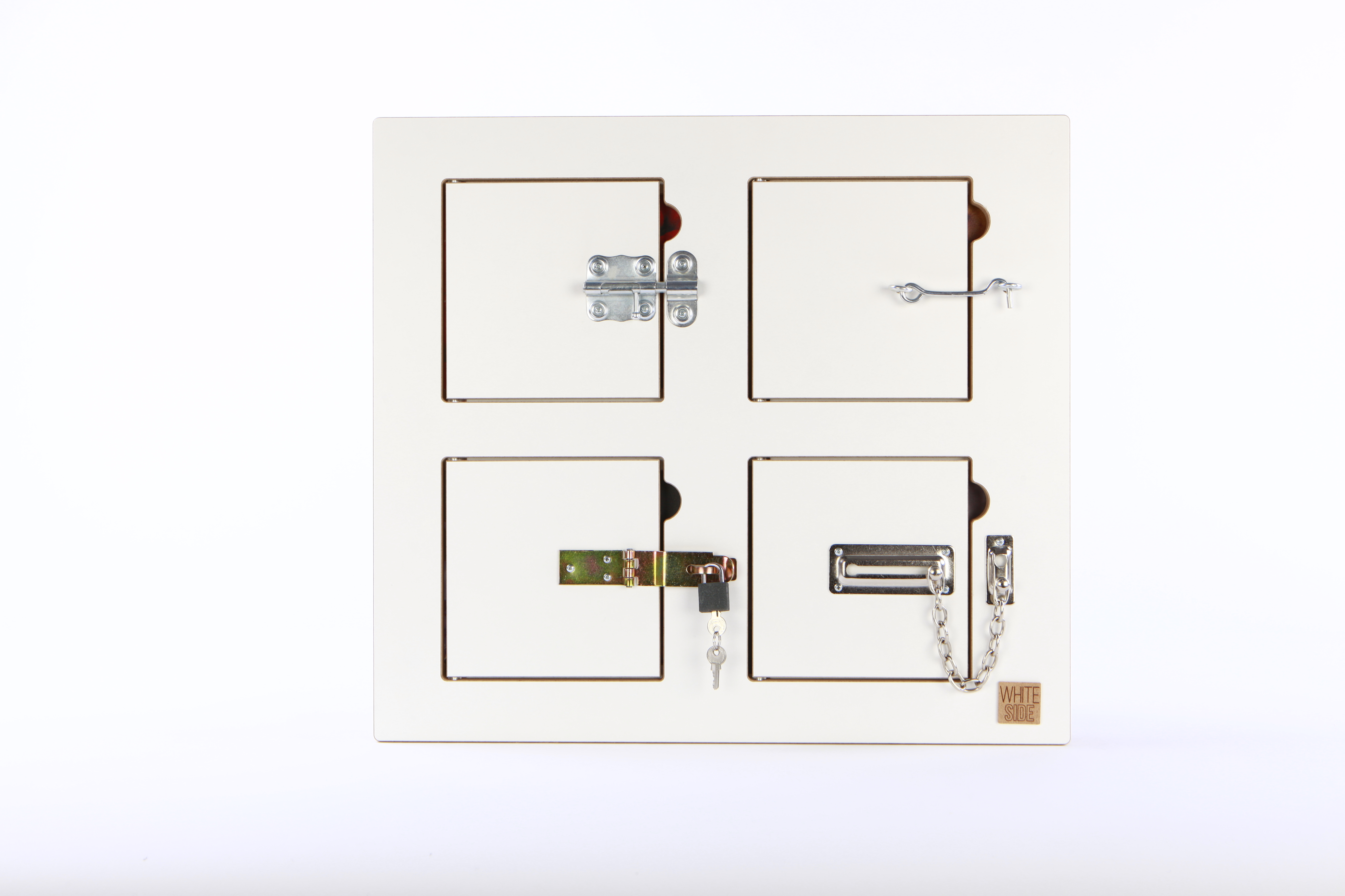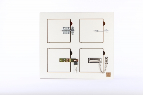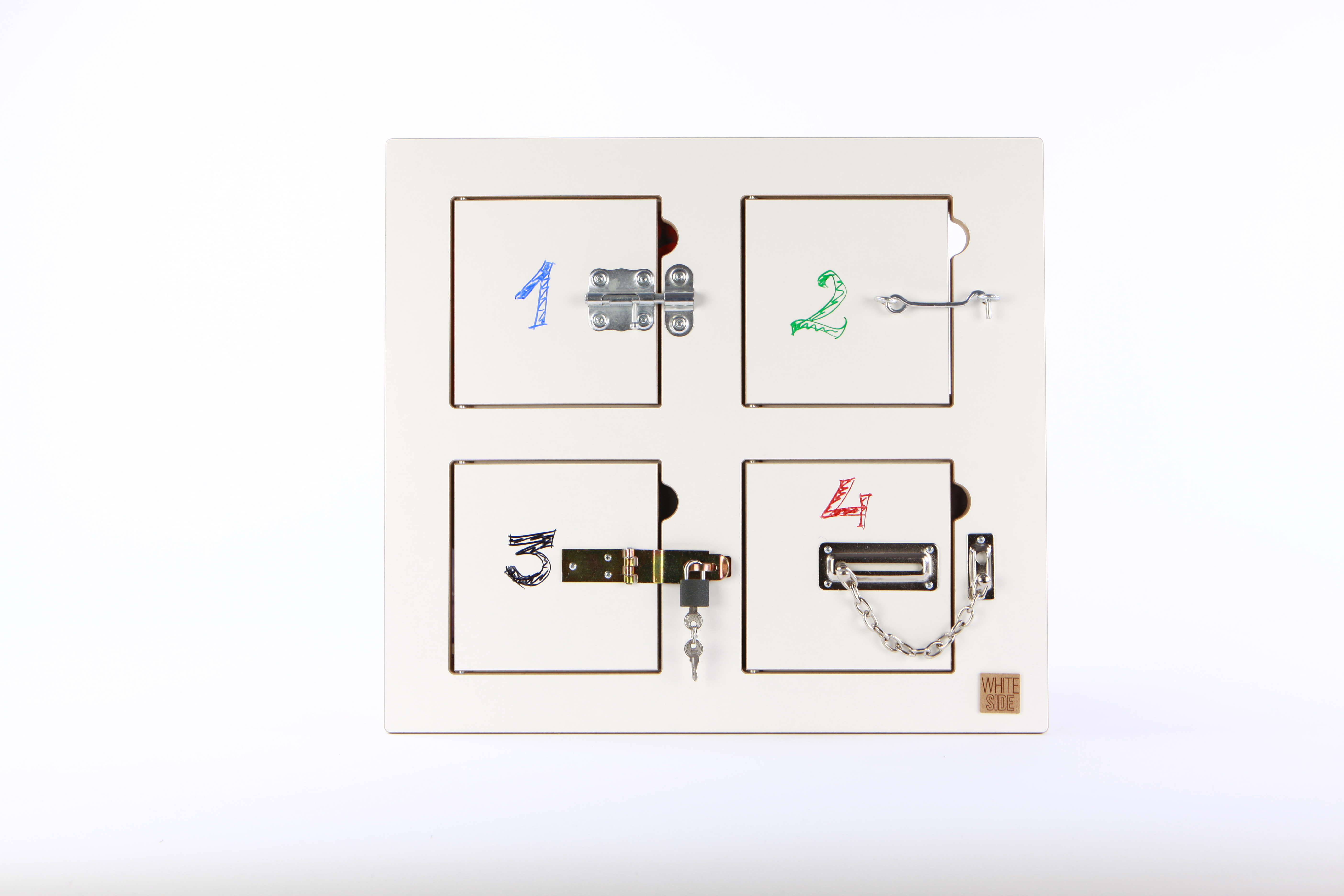 Unlock, unlatch, open the hinged panels, and count on finding fun when the pictures beneath are revealed! Children will delight in discovering what's hiding behind the locked and latched panels on this wooden play board and educational toy in one.