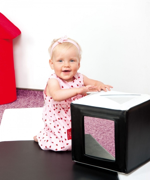 An educational cube with 4 Plexiglas mirrors in various geometrical shapes. Made of PVC-covered high-density foam. The small mirrors are attention attractors for toddlers, who love to watch their own reflections and react to their own movements. As well as providing fun, the mirror helps children to increase their concentration span, discern details, and gradually raise the awareness of oneself as an individual human being. It can also help to learn to speak.
