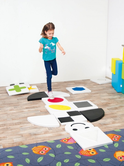 A set of sensory foam shapes for children to arrange. Each block features geometric figures in different colours and textures. Made of PVC covered foam.