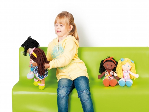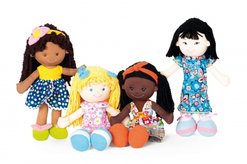 The four girls - Naomi, Klarissa, Emily, Yoko - come from different parts of the world. The appearance of each doll is characteristic of her place of origin. Made of soft fabric, wadded. 4 dolls. H 35 cm.