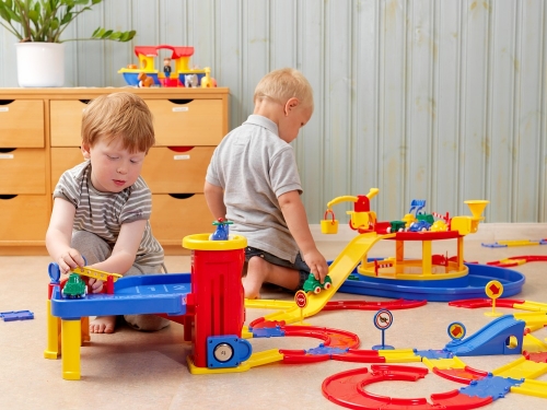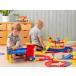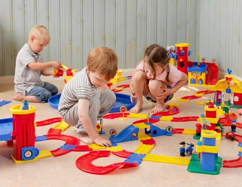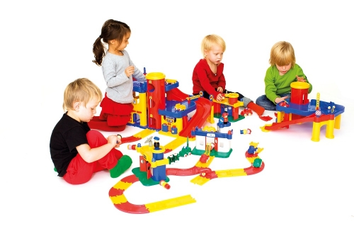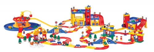 Viking city playset including; 1 large garage, 1 small garage, 1 farm house, 1 police station, 1 fire station, 2 bridges, 1 multiplay garage with harbour, 15 vehicles, 10 figures, 6 animals, 6 signs, 120 road pieces, trees and fences