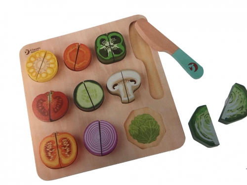 This chunky vegetable set includes reversible 2in 1 tray puzzle and cutting board . Each vegetable has a place on the puzzle board; it’s also a great way to introduce the concepts of part, whole and fractions!