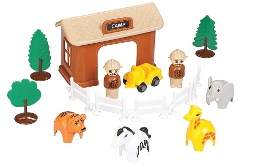 Safari Camp with 2 figures, 1 vehicles, 4 safari animals, 3 trees and fencing, packed in giftbox