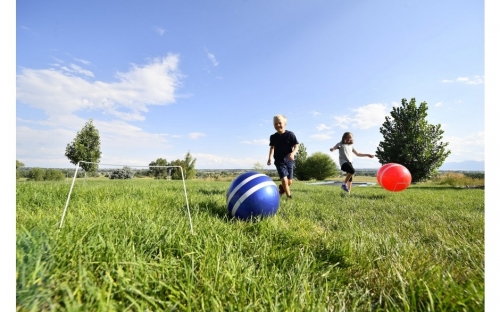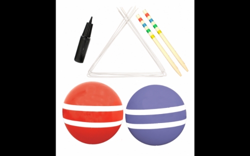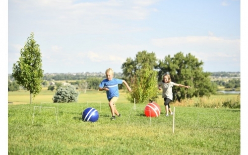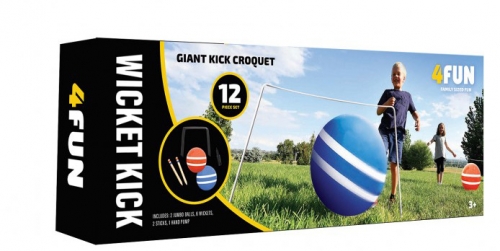 Children will have a ball with this fun outdoor croquet game! Kick Croquet combines the fun of running and kicking a ball with the extra added attraction of guiding it through a course of wickets. You can make the course as hard or easy as you wish just by the way you space the six wickets. Kit includes 2 14” balls, 7 Wickets, 2 wooden poles and 1 hand pump.