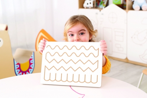 Exercise tablet for both hands. Children use the wooden pencils to trace the patterns, the child practices coordination skills and prepares their hands for learning to write letters. It should be remembered that tablets can be used by children who are also left handed.
