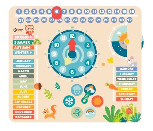 “Who knows what the date is today?” This calendar can help your child learn the different seasons, months, days, weather conditions and times of day.