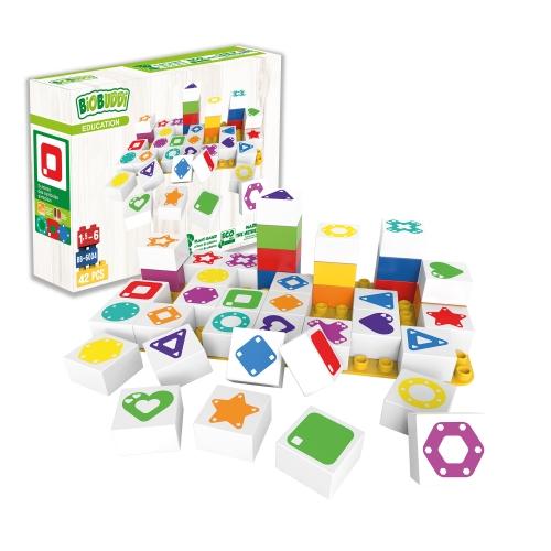 Contains 42 coloured building blocks with prints.