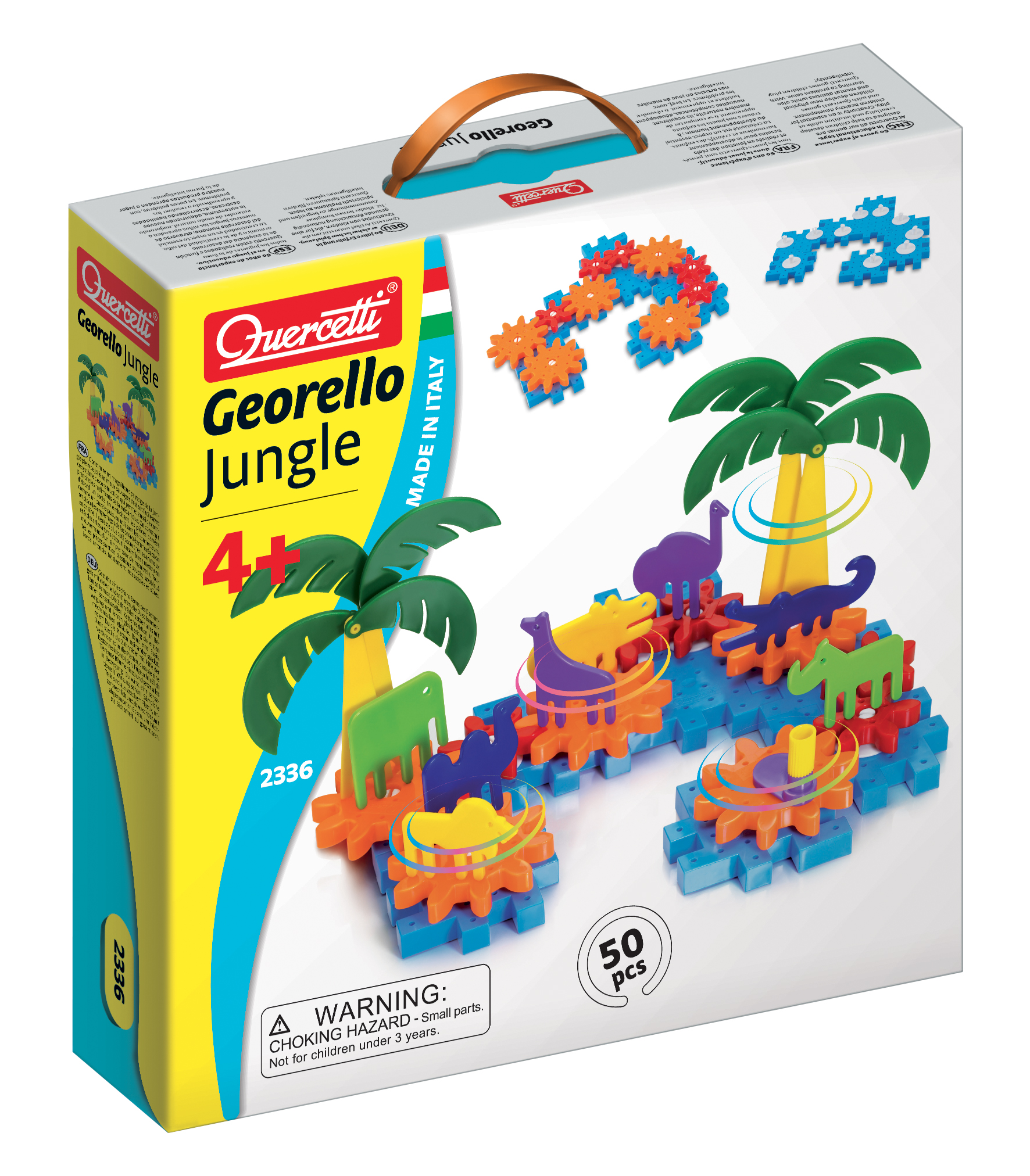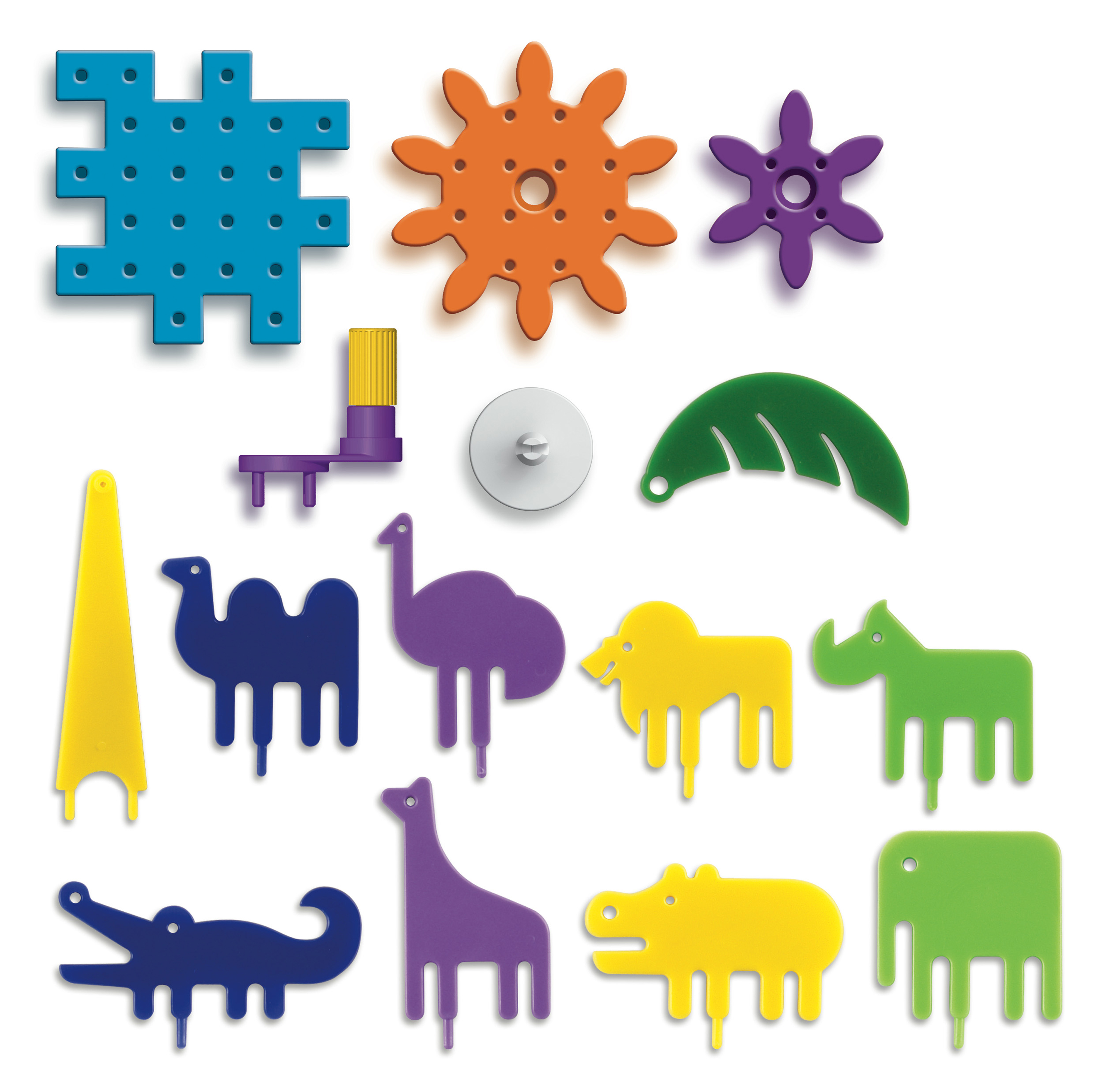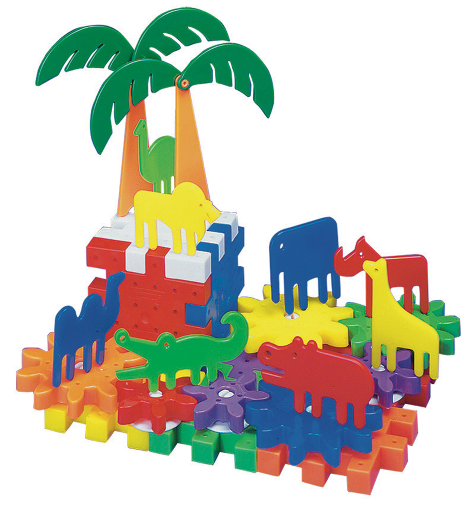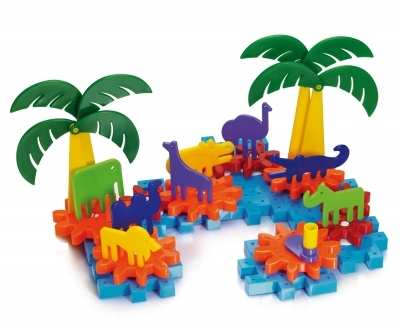 Build a charming jungle scene with this fun construction system that also teaches simple mechanics. Construct a base by interlocking the plates. Then, using connectors, attach the gears to create a chain reaction. Add animals and trees and set everything in motion with spectacular effect. No small parts, all made of soft, washable plastic with round edges, totally unbreakable and safe.