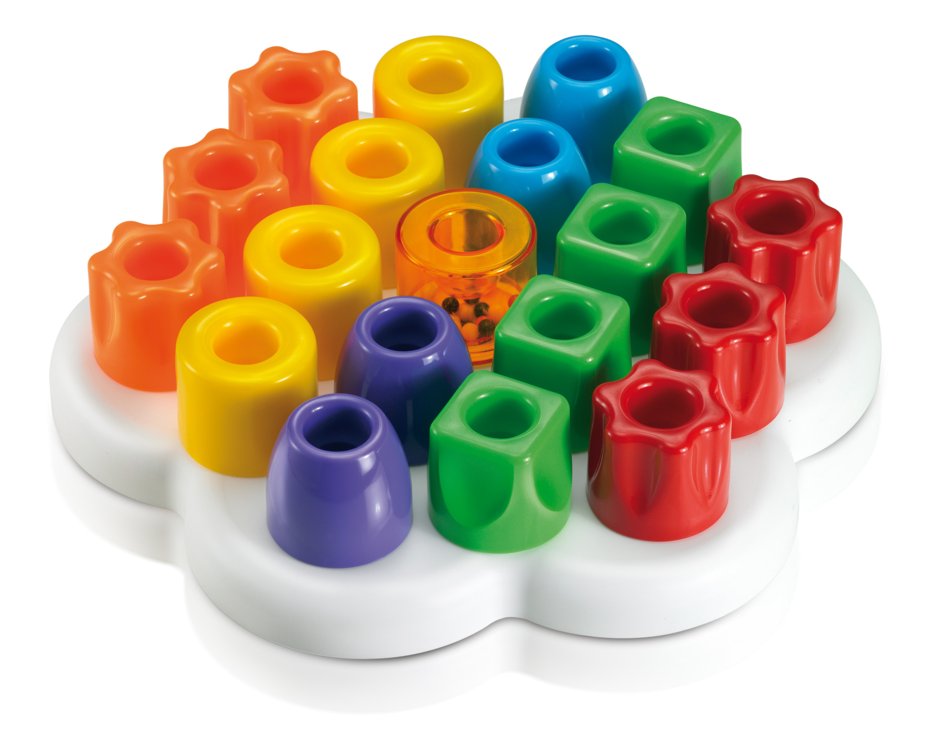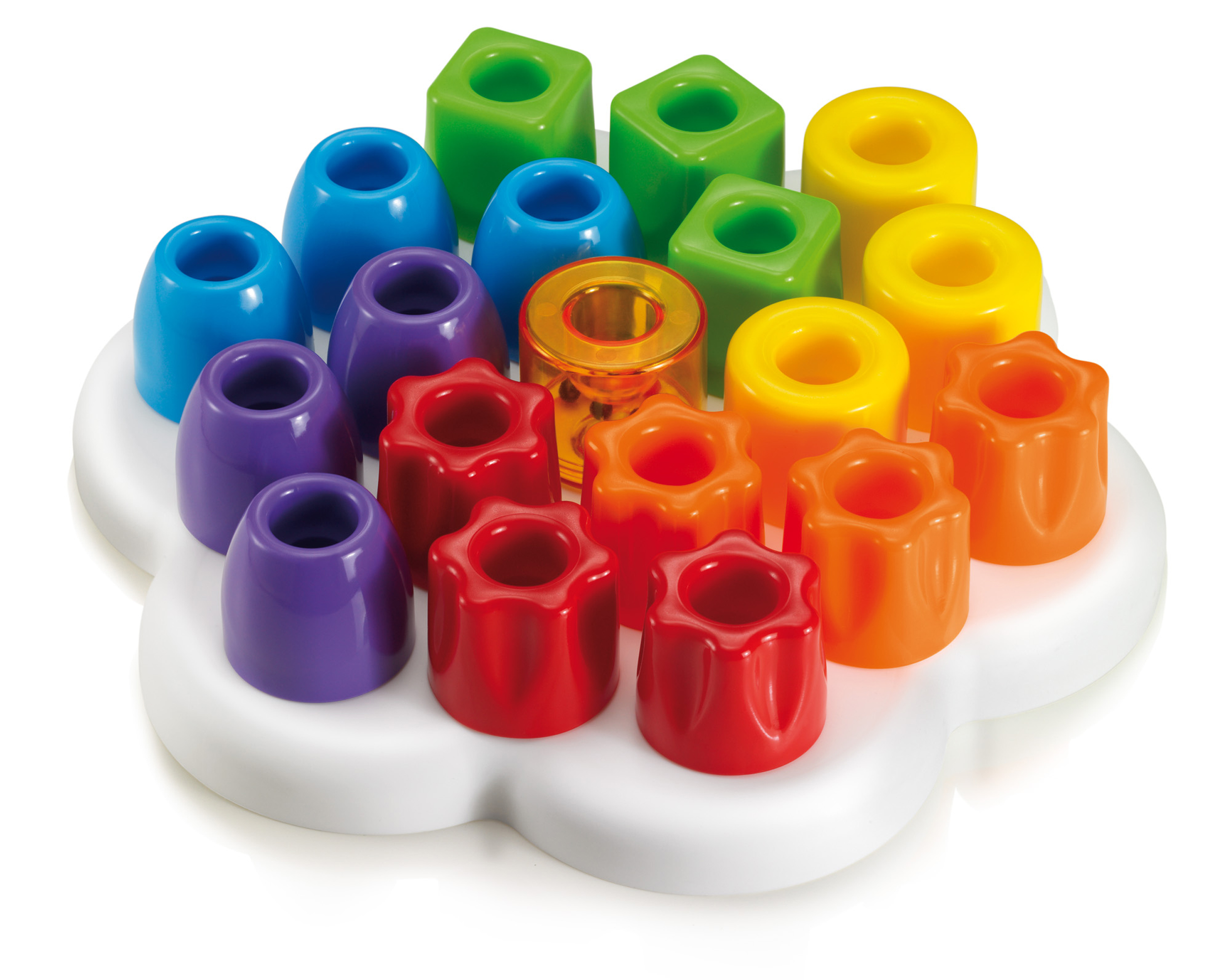 Daisy shaped Peg board in soft touch plastic with 12 chunky easy grip pegs in 4 colours and 4 shapes. Great for shape and colour sorting and simple sequencing. The different shapes and colours stimulate visual perception and hand-eye co-ordination while developing creativity and concentration.