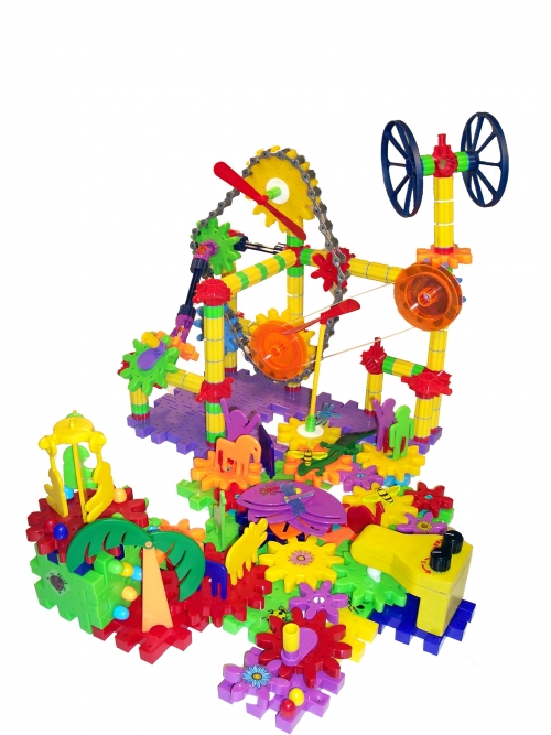 Create a fascinating moving world where people and animals spin, and creatures come to life as they flap their wings and chase the passing dragonflies. This set shows how by turning one gear a static model can be brought to life. The set also includes bands and pulleys and an ingenious chain which enables the gears to be powered in different ways. The set will appeal to boys and girls alike with its colourful stickers and attractive creatures. At the same time the challenge of setting the gears in motion using the chain pulleys and universal joints will interest and fascinate young engineers. Manufactured in tough ABS plastic the set comes in a Gratnell tray with instruction and idea leaflets