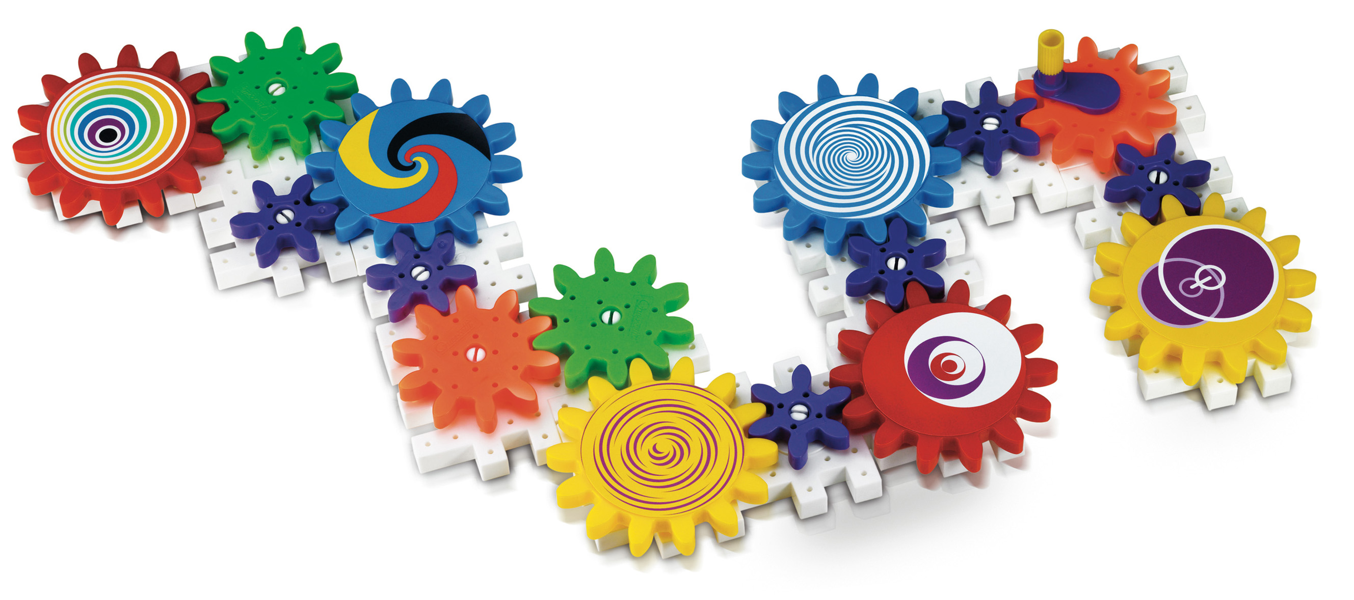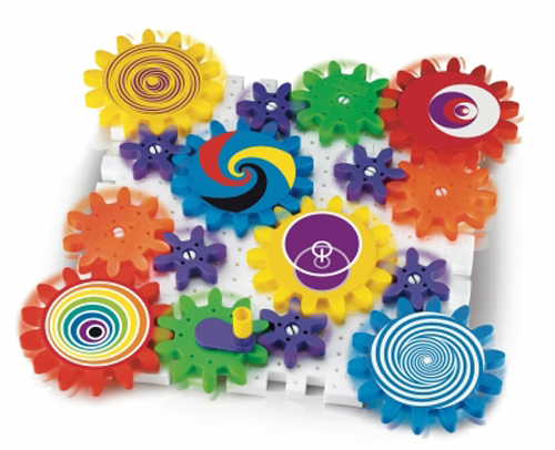 Children will have fun exploring ways to combine the colourful variety of pieces: square plates interlock easily to form flat or 3-D structures; meshing gears create exciting movement in a spectacular chain reaction. Each gear is decorated with a different design that stimulates colour perception and recognition.
