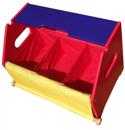 Manufactured in MDF, the toybox is beautifully finished in bright red and blue. Access to the box is through a large open area at the front which is protected by a yellow fabric cover with a simple hook and pole attachment to keep it in place. No hinges or finger traps and the children themselves can access the toys.