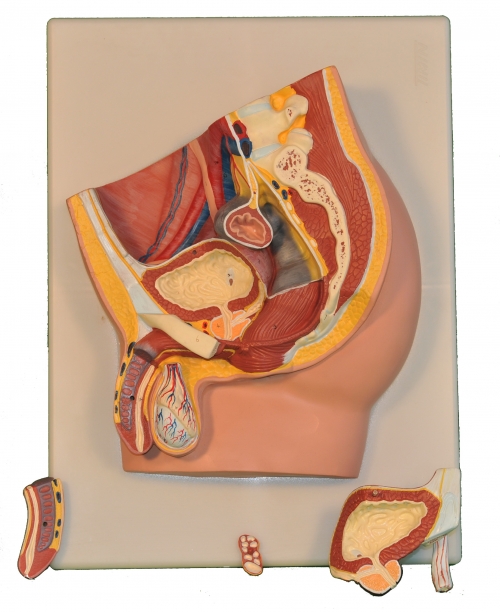 Natural size, durable plastic, the model shows rectum, bladder with prostate and external organs, fully exposed and removable.